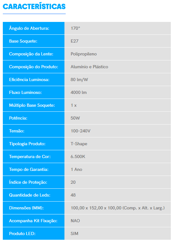 Com soquete E27 e adaptador E40 nos modelos de 100W e 150W, oferecem facilidade de instalação. As Lâmpadas LED High Power possuem alto Índice de Reprodução de Cor (IRC = 80), proporcionando cores mais vivas e naturais, essenciais para ambientes comerciais e industriais. Além disso, seu alto fator de potência (=0,92) contribui para uma maior eficiência energética, reduzindo o consumo de energia.